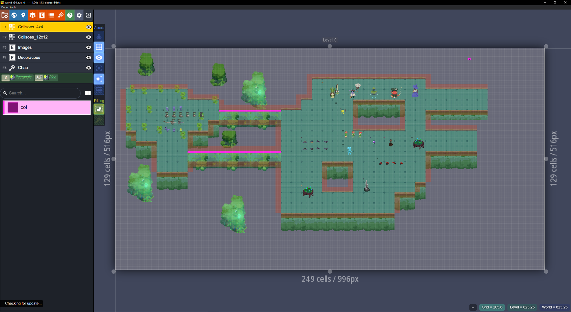 For the visuals, I decided to completely avoid an internal level editor. I'm of the belief that external editors are much better choices when it comes to customization and artistic choice. For the external editor in question, instead of creating something of my own, I decided to go for LDtk, from one of the creators of Dead Cells. For that, I made a custom parser that would translate the .ldtk files into custom logic inside the engine. Unfortunately, I had a very bad experience working with LDtk, which led me to edit its source code constantly in order to solve a lot of the bugs and missing features it was lacking; coding in Haxe/OOP/JS was not fun.