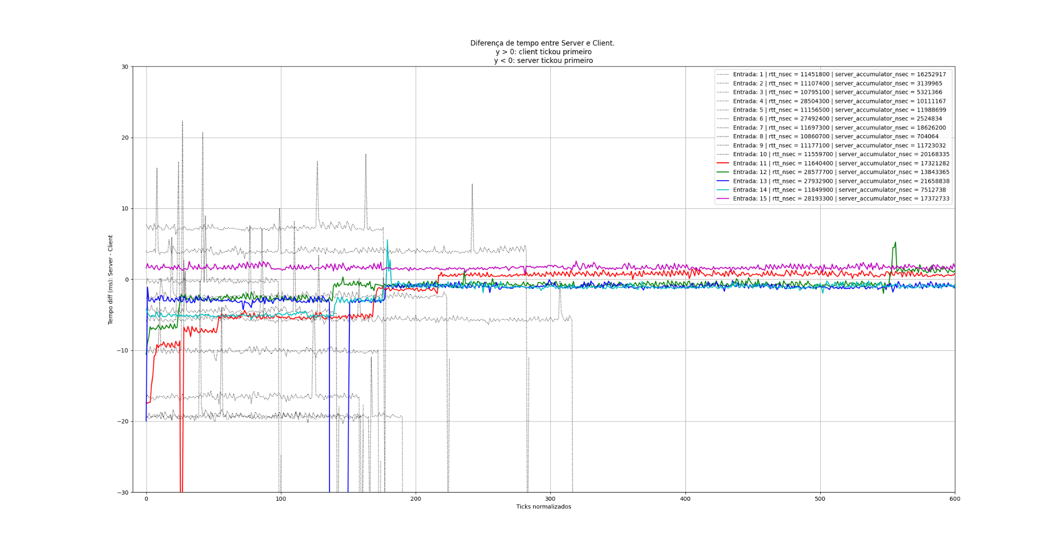 Even though this engine had a pretty robust physics engine, that wouldn't matter if the client felt laggy or if the client and server couldn't agree on the current physics state, leaving the client to be rolledback constantly. This was one of the first big challenges I had with netcode. To fix this issue, I decided to completely separate the updates inside the server and client via well-defined "cycles" and "fixed cycles", in a way that a single clock-sync when the client logs in would be enough to keep latency to a minimum. This, of course, only works in a vacuum, as CPU drift can occur and latency is not constant in time. For that reason, a series of measurements is taken at a fixed rate to identify delta spikes in latency, so the client can process faster or slower to properly have the physics update synchronized. The result is shown in the graph above: a much smaller delta ratio comparing gray entries (old) vs colorful entries (new), indicating a big improvement in synchronization. Not all was solved, as there was still a "minimum ms delta" due to restrictions around the server update frequency, as well as problems of "over-compensation" if the client has a delta-ms too large due to high RTT, but I believe that both could be solved with improved temporal metrics.