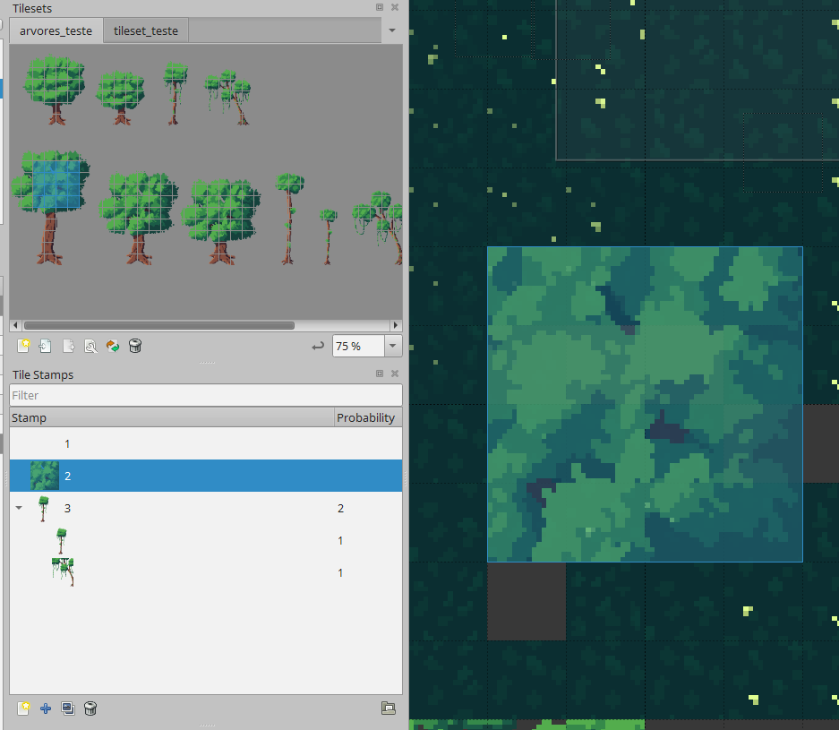Activate the Random Mode using the dice button on the Tool Options toolbar to have the Stamp Brush paint with random tiles from the tile stamp. The probability of each tile depends on how often it occurred on the tile stamp, as well as the probability set on each tile in the Tileset Editor.