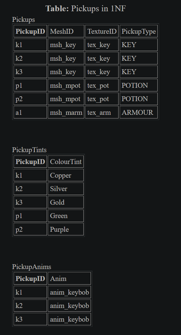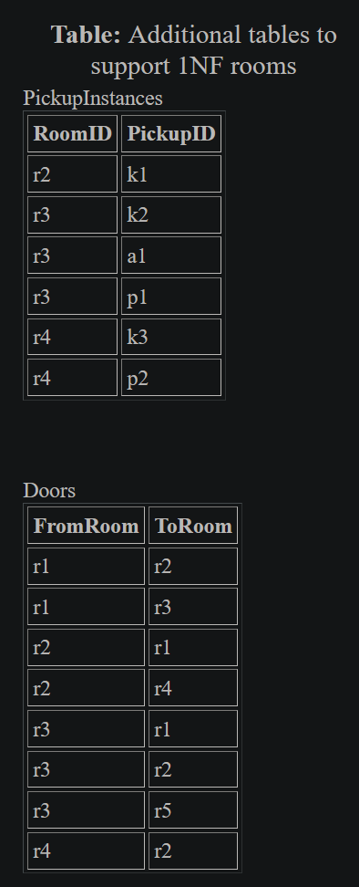 • Having multiple doors per room is tricky to handle in this table. How would you figure out what doors it had? The same goes for whether the door is locked, and whether there are any pickups. The first stage in normalizing is going to be reducing the number of elements in each cell to 1, and increasing it to 1 where it's currently NULL.