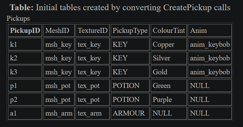 • Laying out the data in this way takes less space in larger projects as the number of NULL entries or arrays would have only increased with increased complexity of the level file. By laying out the data this way, we can add new features without having to revisit the original objects. For example, if we wanted to add monsters, normally we would not only have to add a new object for the monsters, but also add them to the room objects. In this format, all we need to do is add a new table such as the table below.