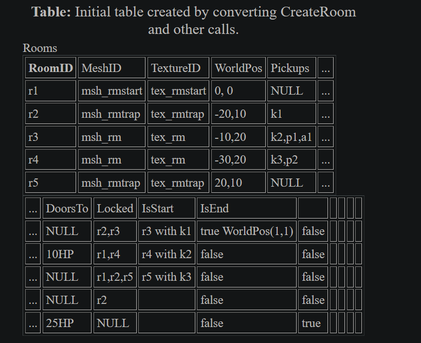 • The table DoorsTo, Locked, etc  is a continuation of the table RoomID, MeshID, TextureID, etc .