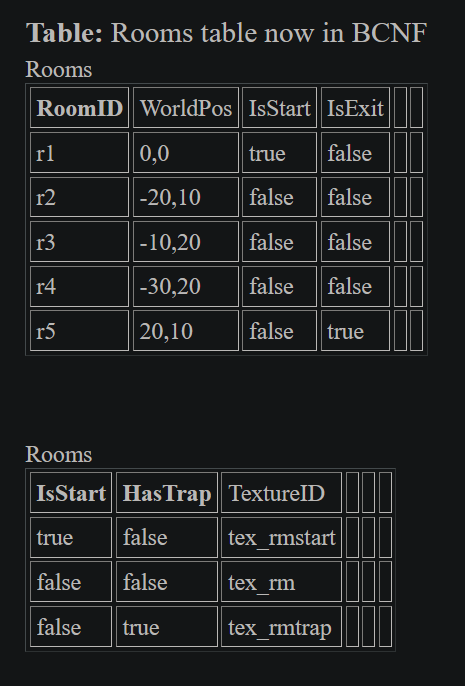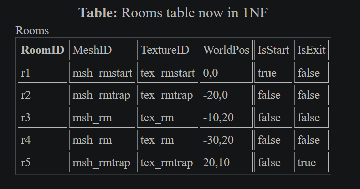 • In there we saw single elements that contained multiple atomic values. We need to remove all elements from this table that do not conform to the rules of first normal form. First, we remove reference to the pickups, as they had various quantities of elements, from none to many. Then we must consider the traps, as even though there was only ever one trap, there wasn't always a trap. Finally, we must strip out the doors, as even though every room has a door, they often had more than one. Remember that the rule is one and only one entry in every meeting of row and column. In table [*] it shows how we only keep columns that are in a one to one relationship with the RoomID.