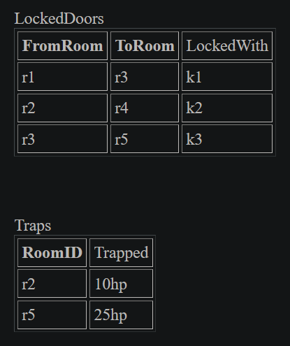 • In this case, the primary key is made up of two columns, so the LockedDoors table has a large foreign key and a small bit of extra detail about that entry in the foreign table.