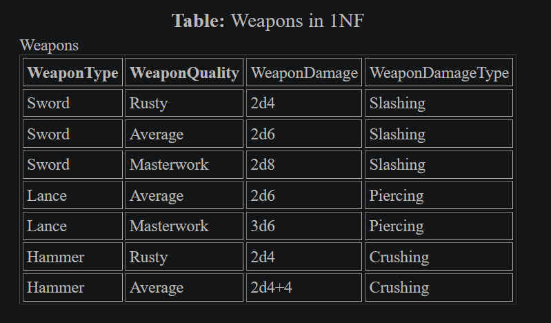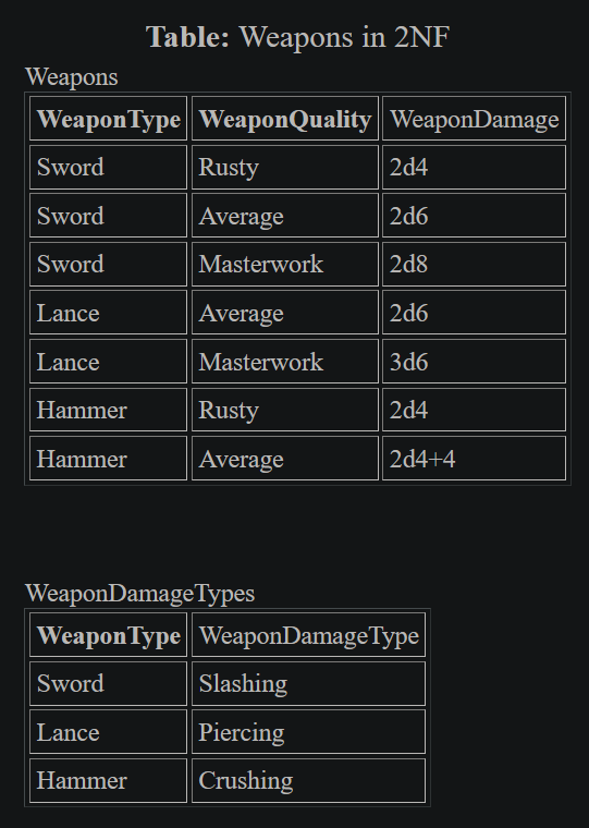 • It makes sense for us looking at the table that the primary key should be the compound of WeaponType and WeaponQuality, as it's a fairly obvious move for us to want to look up damage amount and damage type values based on what weapon we're using. It's also possible to notice that the DamageType does not depend on the WeaponQuality, and in fact only depends on the WeaponType. That's what we mean about depending on part of the key. Even though each weapon is defined in 1NF, the type of damage being dealt currently relies on too little of the primary key to allow this table to remain in 2NF. We split the table out in table [*] to remove the column that only relies on WeaponType. If we found a weapon that changed DamageType based on quality, then we would put the table back the way it was. An example might be the badly damaged morningstar, which no longer does piercing damage, but only bludgeons.