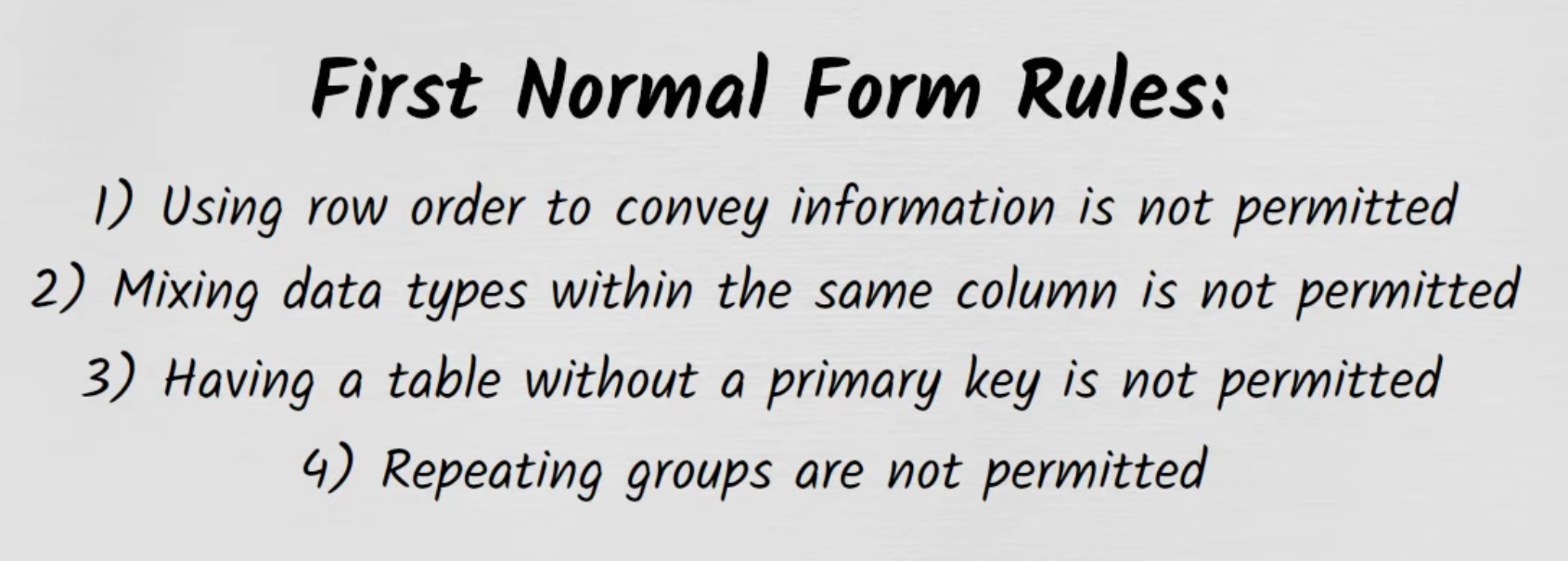 • If a table is in first normal form, then every cell contains one and only one atomic value. That is, no arrays of values, and no NULL entries. First normal form also requires every row be distinct.