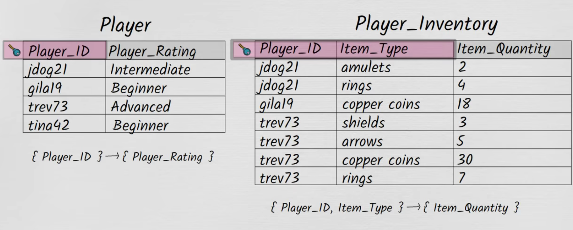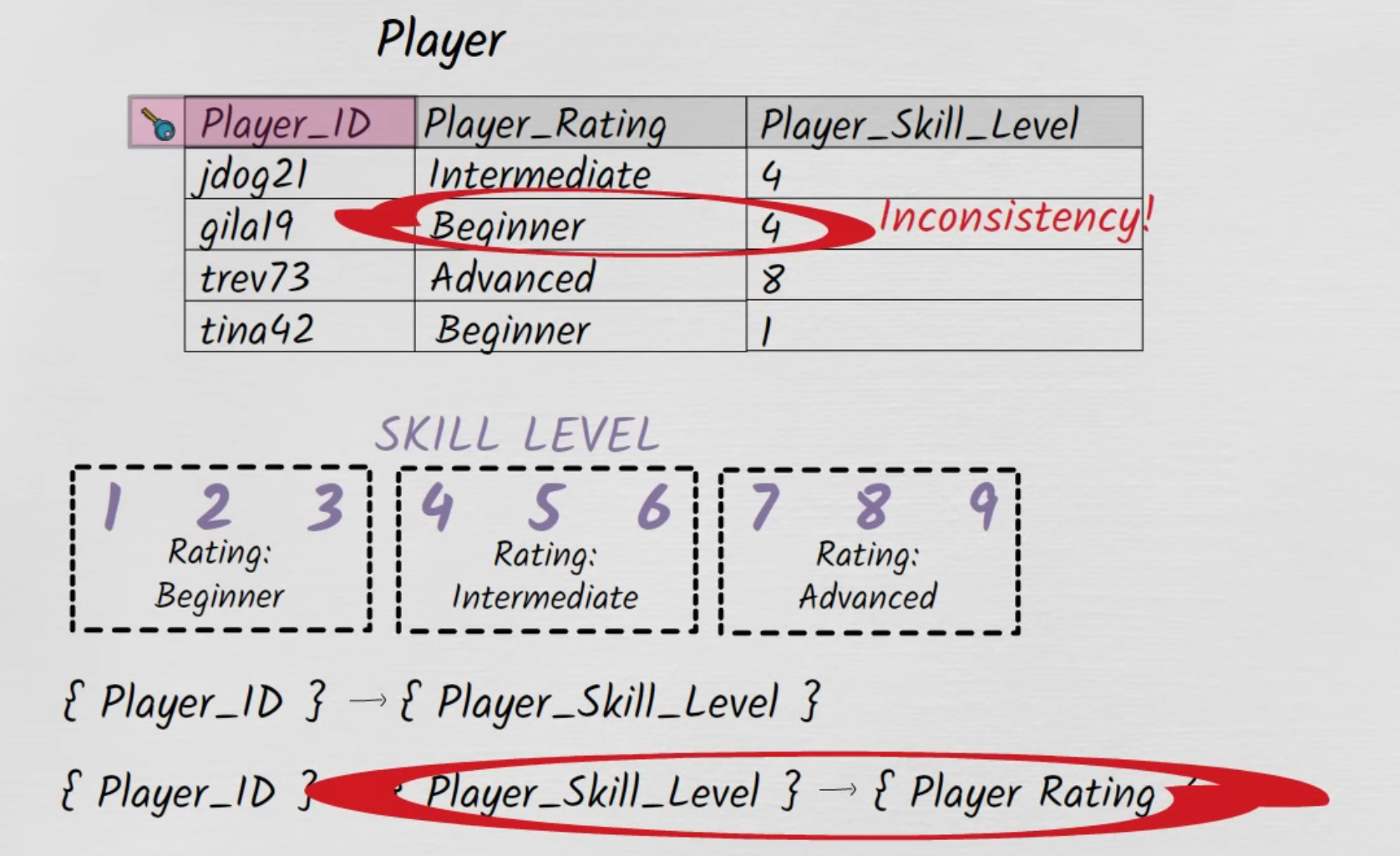 • If jdog21  updates its Player_Rating  to Advanced , but this is not updated across all of his entries, the data will be inconsistent.