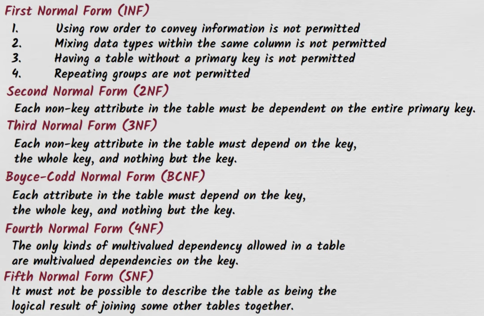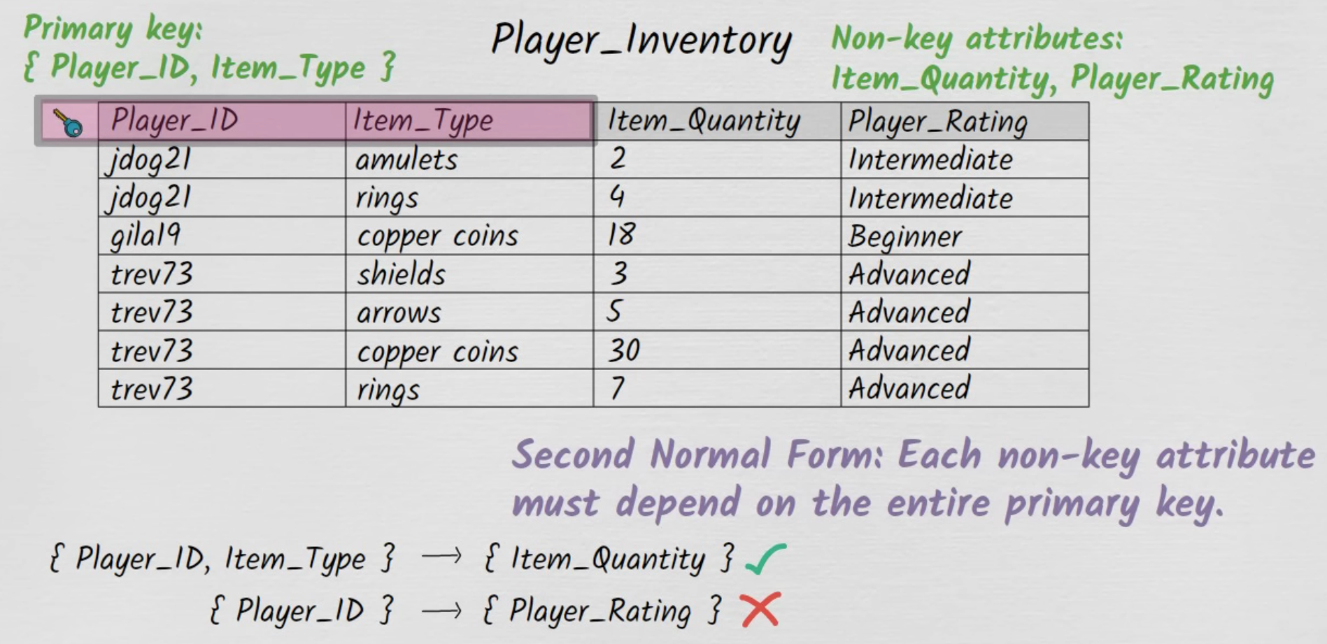 • Second normal form is about trying to pull out columns that don't depend on only a part of the primary key. This can be caused by having a table that requires a compound primary key, and some attributes of the row only being dependent on part of that compound key. An example might be where you have weapons defined by quality and type, and the table looks like that in table [*], what you can see is that the primary key must be compound, as there are no columns with unique values here.