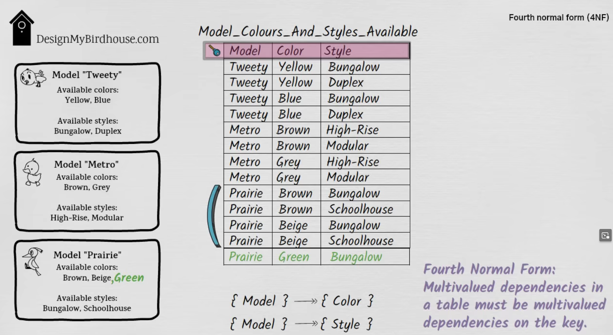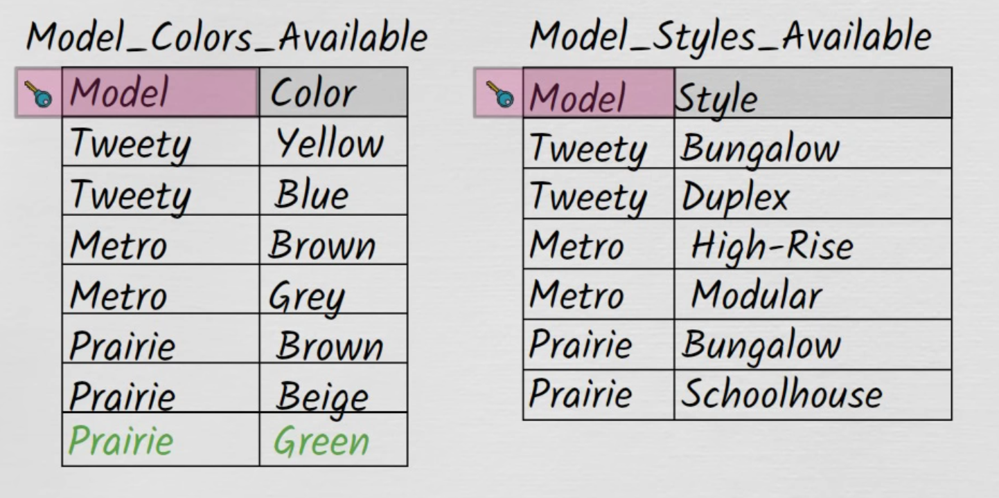 • Available Color s should be totally independent from Style s, but when adding a new Color , this table requires having to add 2 entries: one for Schoolhouse  and Bungalow .