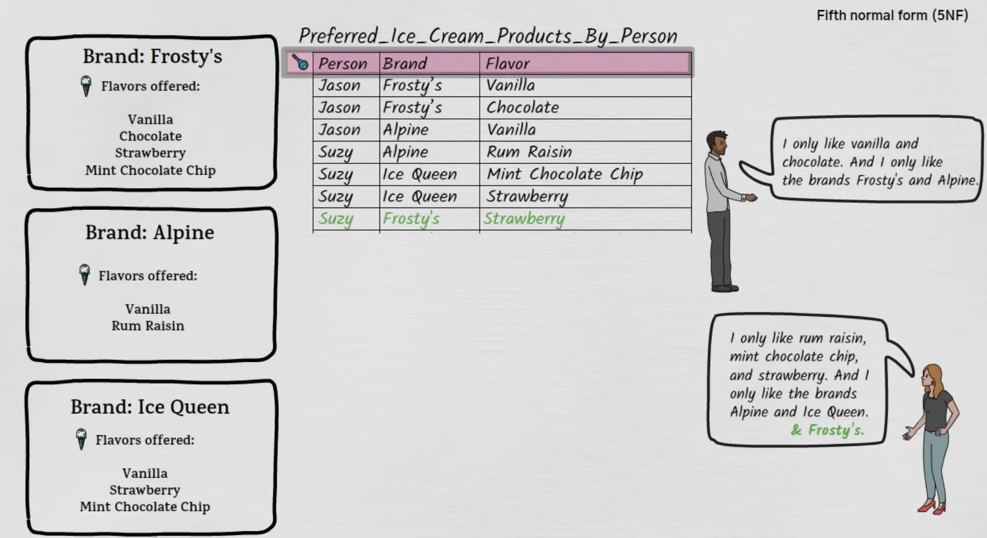 • If Suzy  decides that she likes the Brand   Frosty's  as well, and we forget to add the entry Suzy, Frosty's, Mint Chocolate Chip , then this is a logical inconsistency.