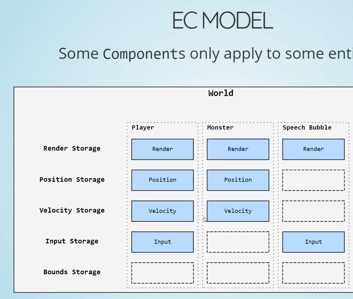 If we want to loop over everything with a position and velocity components, we would have to loop over 2 different tables.