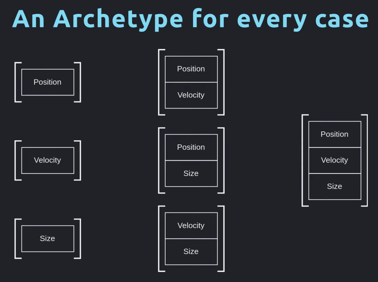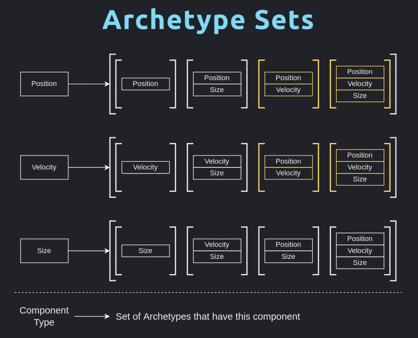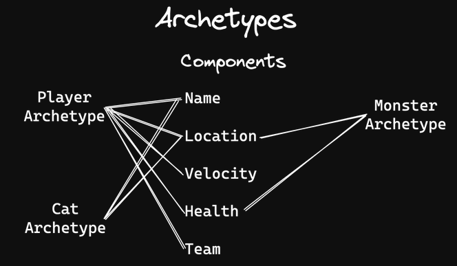 An archetype is a grouping of entities that all share the exact same set of component types. Each archetype stores component data in contiguous, component-oriented arrays so that iteration over entities that have a particular set of components is very fast.