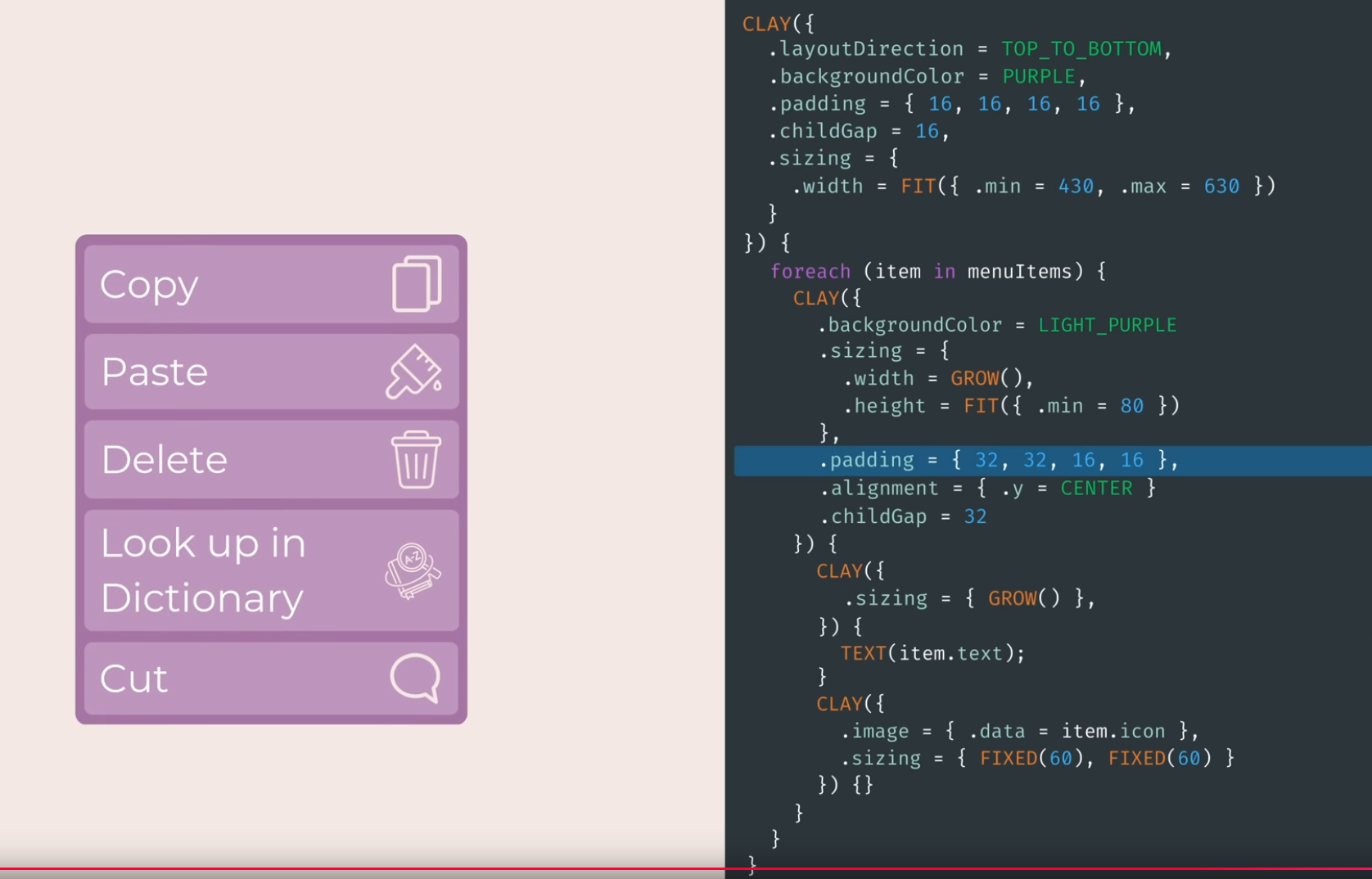 CLAY({ .id = CLAY_ID("Outer"), .layout = { .padding = CLAY_PADDING_ALL(16) } }) {