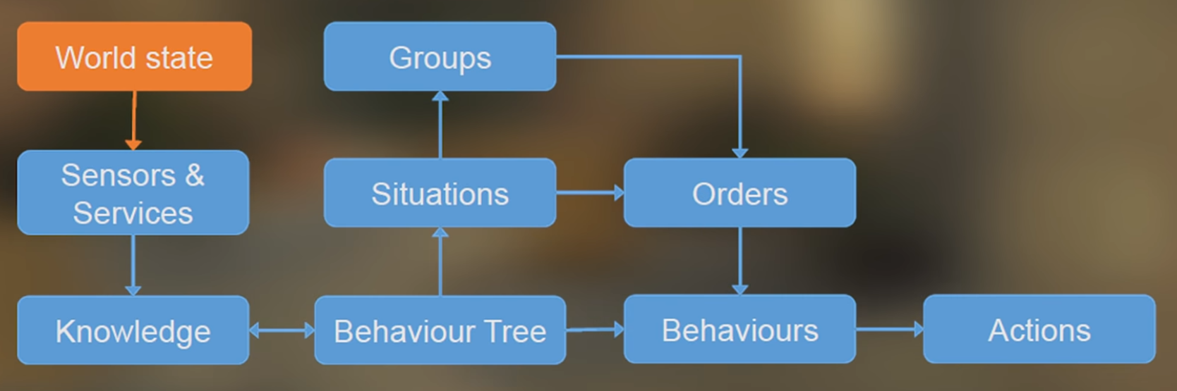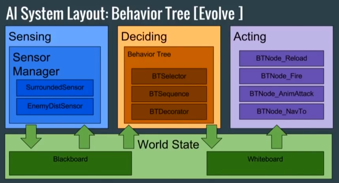 • The 'Blackboard' (variables and world state) is read by the Tree and also written by the Tree when executing something.