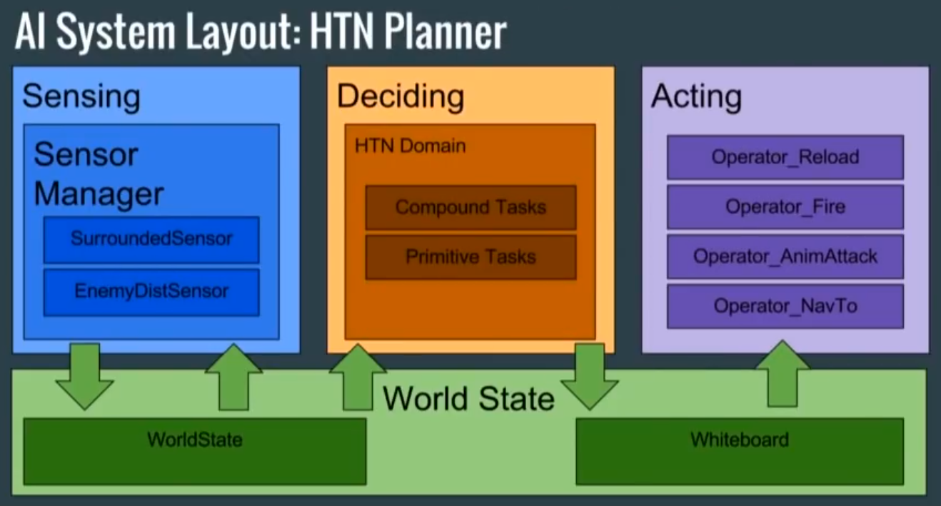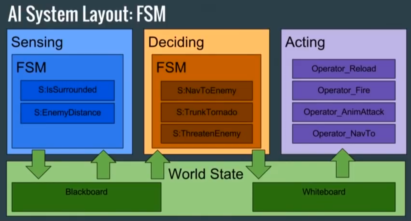 • Each possible action has a weight and conditionals to be executed, generating a "pseudo-score" for each possible action to fulfill the Goal, choosing the best action at the end.
