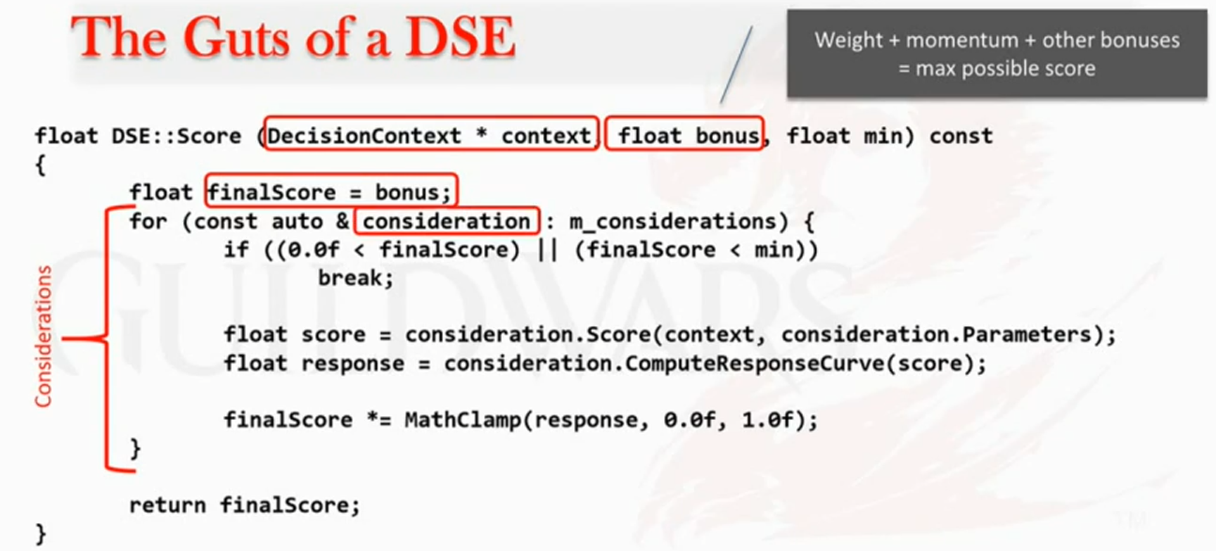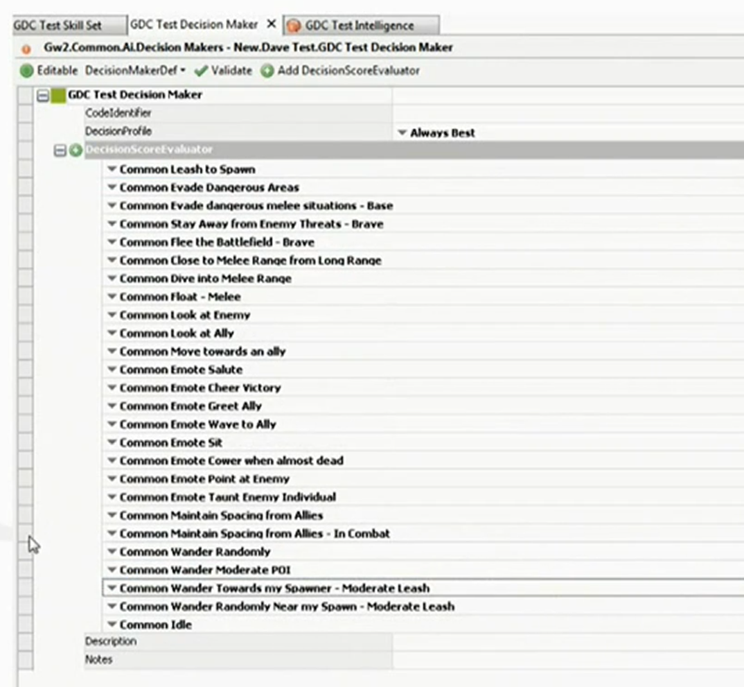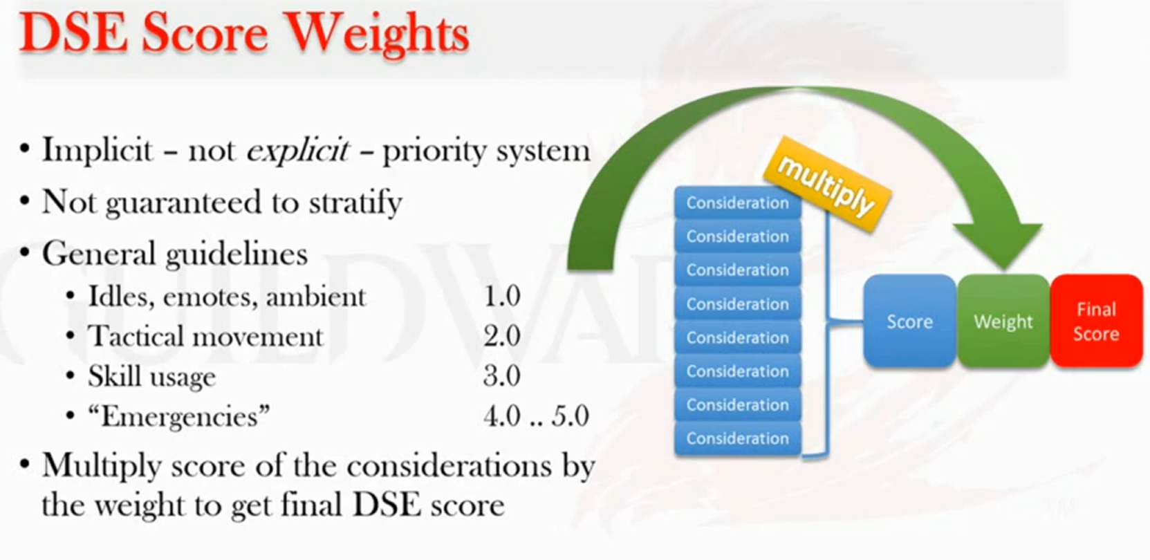 • The only thing that truly makes the entity not be "stupid" in combat (or vice versa), is that each DSE has an attached weight, so that Skill Set DSEs have weight 3.0, while Decision Maker DSEs can vary from weight 1.0 up to about 4.0~5.0.