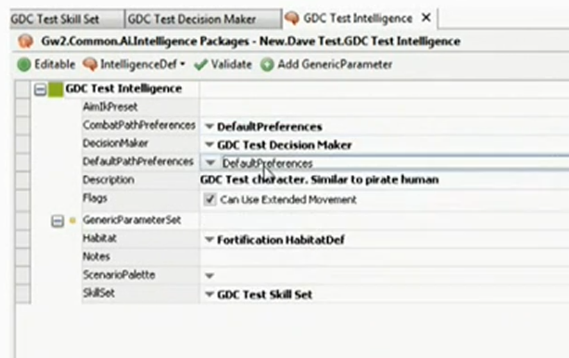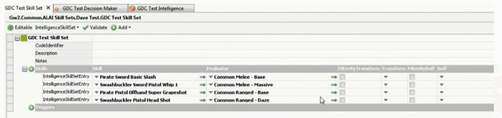 • The only difference between a Skill Set and a Decision Maker is that a Skill Set uses an "export" parameter corresponding to the animation / attack action. This is done because the DSEs used for Skill Sets are not specific to a single action and can be used across multiple characters.