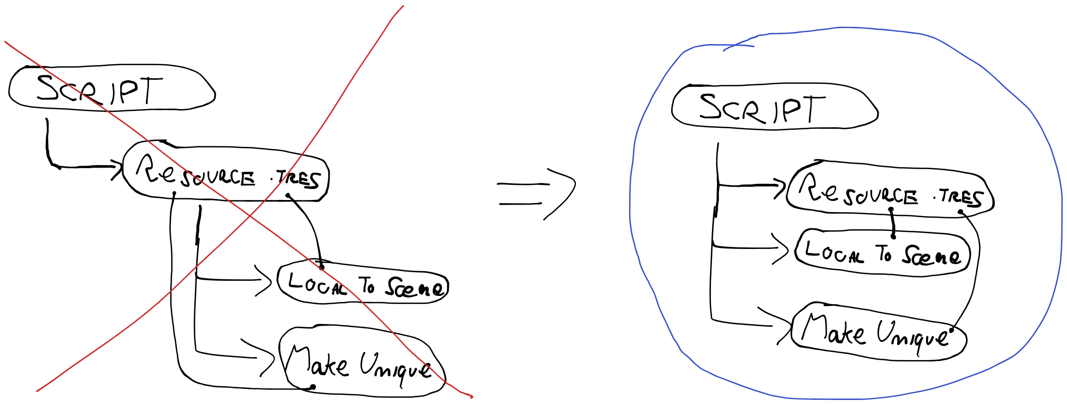 We note that when making a Resource Local to Scene or Make Unique, dependencies between the "Original Resource" and its 'unique version' are not created. As a consequence, for example, you can put a Resource in a Scene, make it unique via Make Unique and then delete it from the FileSystem without problems, since the only dependency of this new Resource version is the Script. Visually, when making 'unique versions' of a Resource, you always create "siblings" of that Resource, never "children".